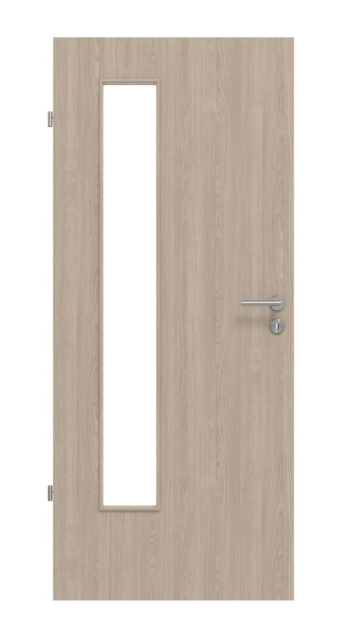 Zawiasy wbudowane w skrzydło drzwiowe nadają smukłemu przeszkleniu modny akcent. Łagodna struktura drewna przebiega wzdłuż dekoru dąb szary. Długa żywotność obiecuje powierzchnia Durat wykonana z melaminowej żywicy dzięki swojej szczególnej odporności na zarysowania i uderzenia.