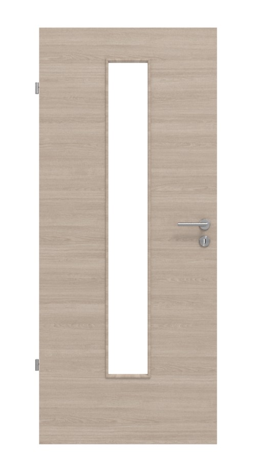 W swojej wąskiej formie wycięcie ze szkła w środku skrzydła drzwi nadaje nowoczesny akcent. Delikatne linie cienkich słojów drewna rozciągają się poziomo na dekorze dąb szary. Dzięki swojej solidnej konstrukcji, łatwa w pielęgnacji powierzchnia Durat jest odporna na zarysowania i uderzenia.