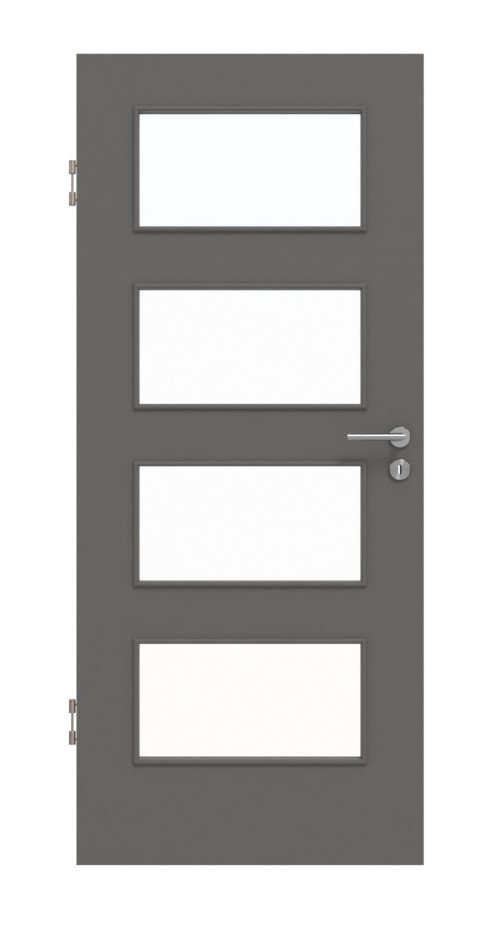 Cztery szerokie przeszklenia z otaczającymi je listwami szklanymi pozwalają na obfite doświetlenie Twojego pomieszczenia. Jednolita nałożona lakier w kolorze szarym tworzy elegancką i spójną powierzchnię.