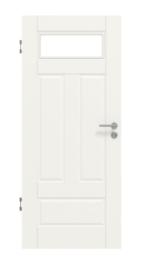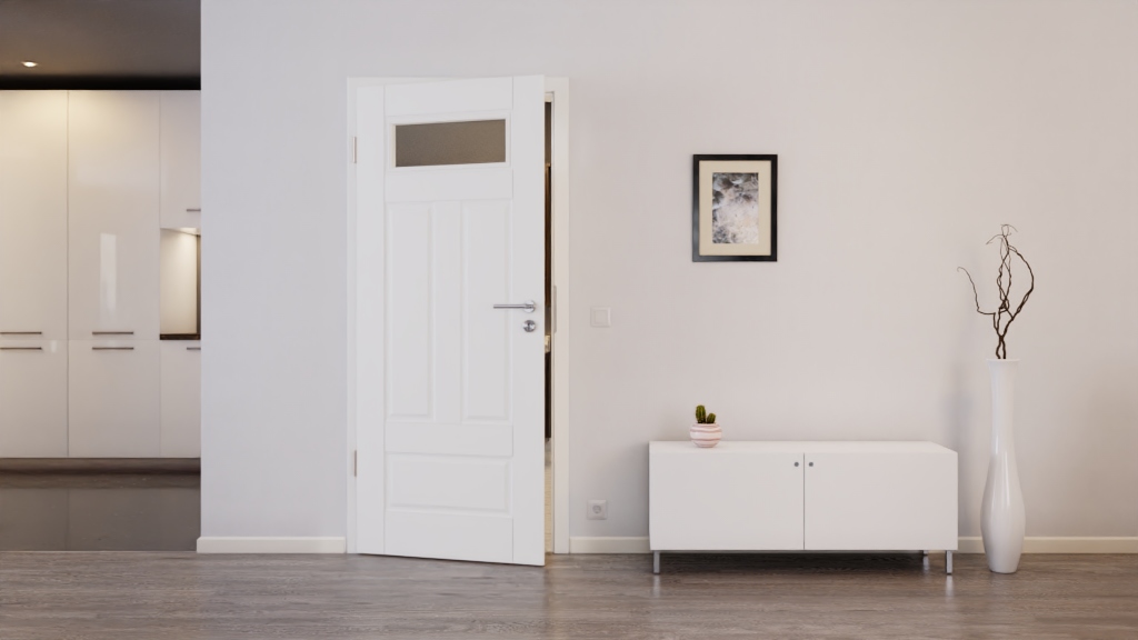 Klasycznie zaprojektowane drzwi w jednolitym białym lakierze z rdzeniem z rurkowej płyty wiórowej: