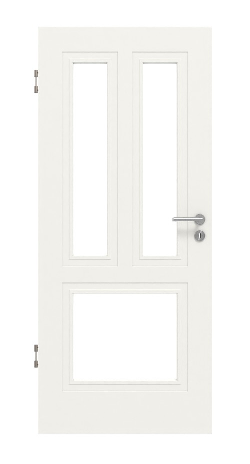 Trzy przeszklenia nadają modelowi zapraszający wygląd i wprowadzają dodatkowe światło do pomieszczenia. W stylowej ramie biegną szerokie frezowania profilu wokół powierzchni szklanych. Wykończenie stanowi nieskazitelna biała farba, która zachwyca swoją intensywnością kolorystyczną.