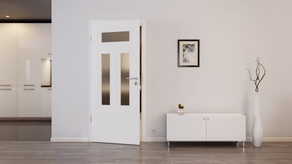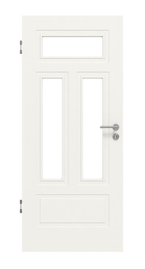 Najważniejszym elementem tych drzwi są trzy szklane wstawki, które wprowadzają naturalne światło do pokoju i tworzą otwartą atmosferę. Otwory świetlne otoczone są szerokimi frezowaniami, które w dolnej części tworzą dodatkowy prostokąt. Dzięki białemu wykończeniu lakierem na bazie wody ponadczasowy design jest doskonale widoczny.