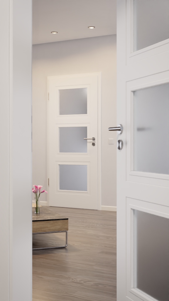 Wyjątkowe cechy to trzy duże przeszklenia, które wypełniają Twoje pomieszczenia naturalnym światłem, tworząc przyjazną atmosferę. Wokół otworów szklanych biegną wytłoczone profilowania w stylu ramy. Czysta biel powierzchni lakierowanej doskonale wpasowuje się w różnorodne style wnętrz.