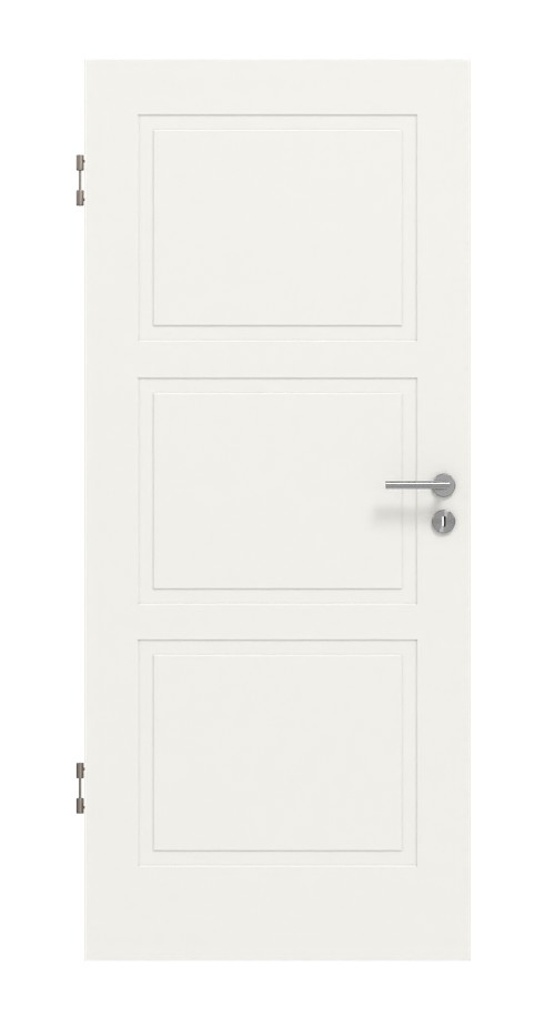 Na skrzydle drzwi wyróżniają się trzy równe prostokąty w stylu ramowym, które są efektem szerokich frezów profilowych. Olśniewająca biel wysokiej jakości lakieru podkreśla ponadczasowy charakter designu.