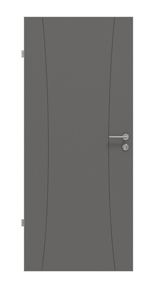 Dwie lekko wygięte V-fugi zdobią skrzydło drzwi i nadają mu elegancki akcent. Harmonijny odcień Hygge szary podkreśla nowoczesny wygląd dzięki gładkiemu lakierowaniu.