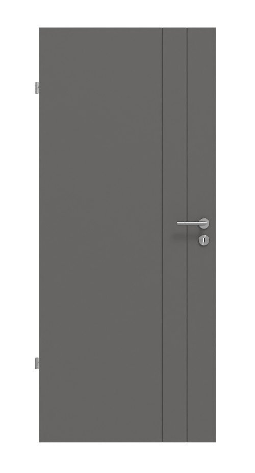 Obok klamki biegną dwie długie frezowania liniowe równolegle do siebie na skrzydle drzwi. Równomierny lakier w zrównoważonym odcieniu Hygge szary dodatkowo zdobi model.