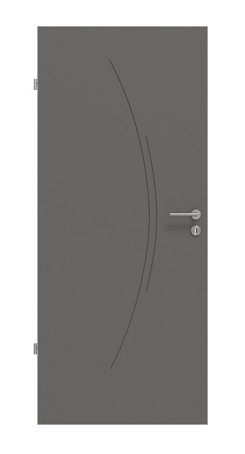 W skrzydle drzwi frezowane są dwa różnej długości, kręte V-fugi, które ściśle do siebie przylegają. Jednolita lakierowana powierzchnia w kolorze Szary Hygge dopełnia atrakcyjny design o spokojnej, harmonijnej aurze.