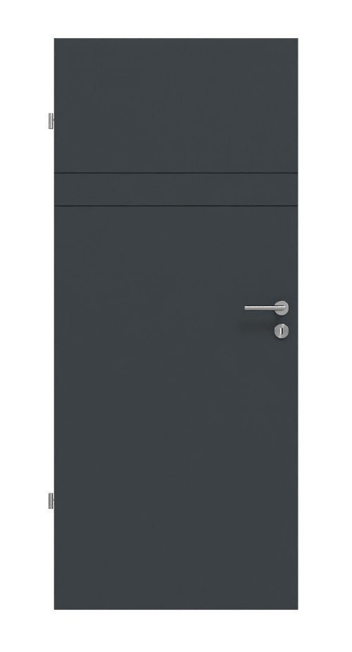 Na wysokości oczu w skrzydle drzwi frezowane są dwa równolegle biegnące V-rowki. Atrakcyjny design dopełnia wysokiej jakości lakier w kolorze antracytowym podobnym do RAL 7016.
