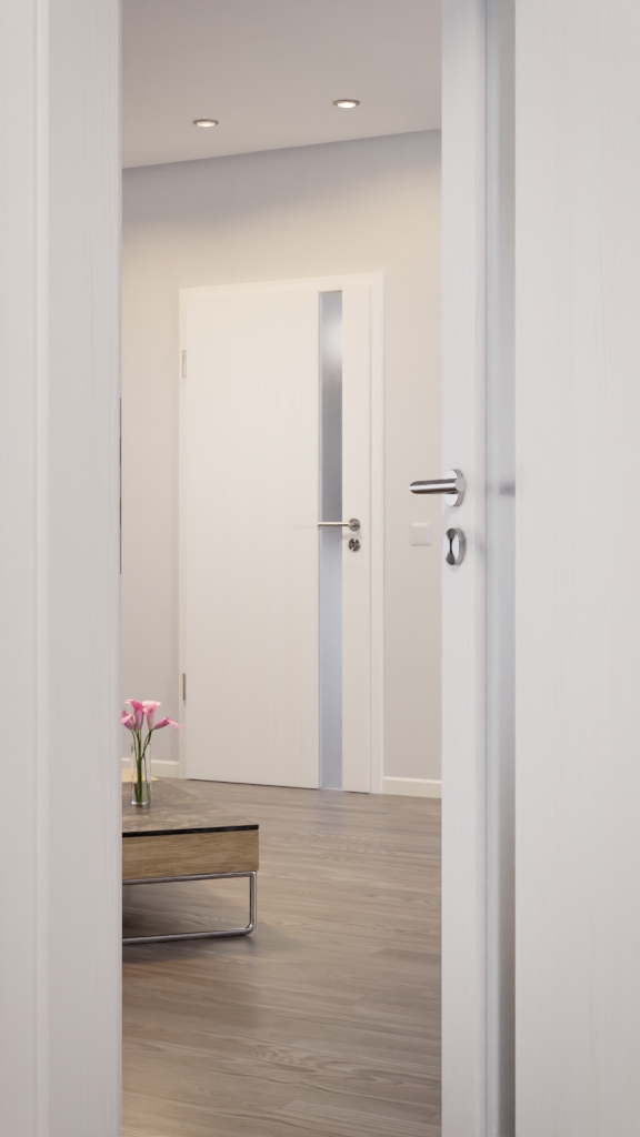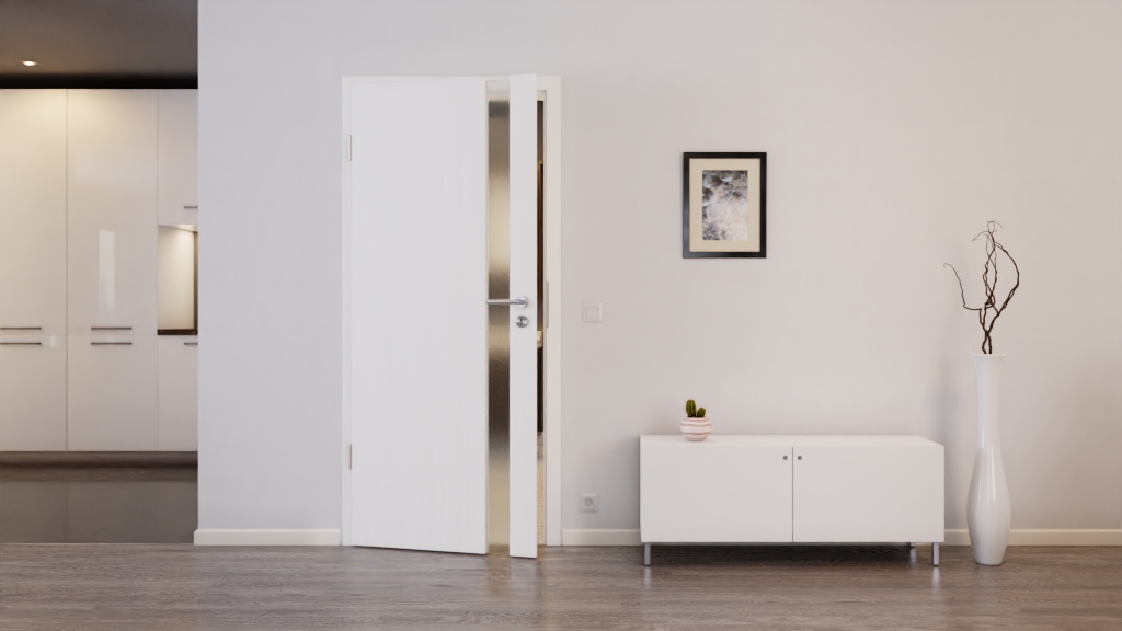 Trwałe drzwi wewnętrzne z wyjątkowo odpornym na uderzenia dekoracyjnym Durat i segmentem szklanym: