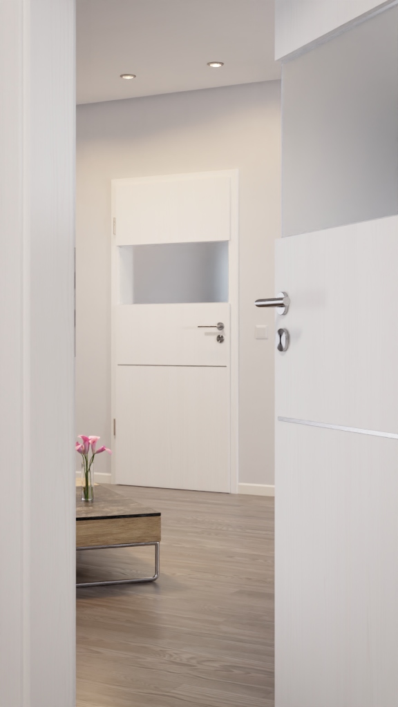Robustne drzwi wewnętrzne z bardzo odporną na zarysowania powłoką Durat z wkładką szklaną:
