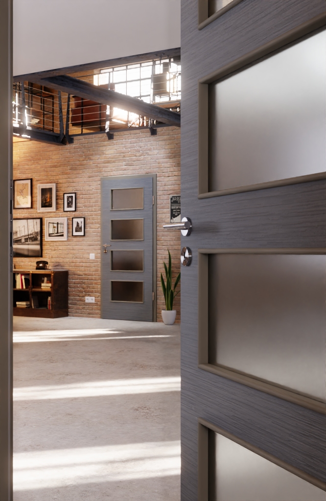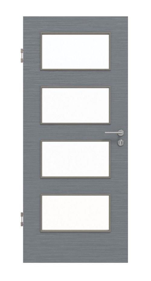 Cztery przestronne przeszklenia dostarczają dodatkowego światła do ciemnych pomieszczeń. Są one harmonijnie oprawione w nałożone listwy. Na dekorze Versio w szarości widoczna jest wyczuwalna struktura, która zapewnia wyjątkowe momenty światła i cienia. Powierzchnia w jakości Durat jest szczególnie odporna na uderzenia i ścieranie oraz łatwa w pielęgnacji.