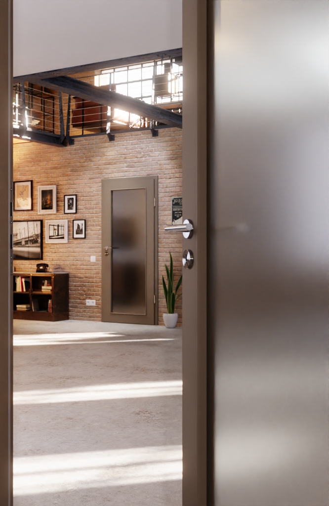 • Drzwi wewnętrzne w wykończeniu Basic lakier matowy taupe (kolor ciemnoszaro-brązowy)