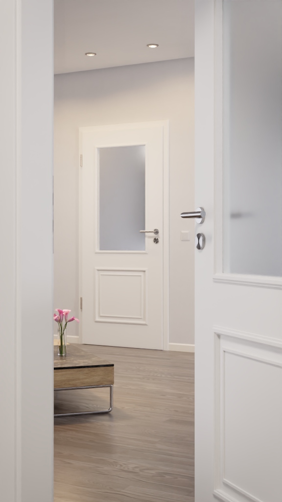 Duże przeszklenie, nałożone listwy szklane i kasetonowy wygląd z profilowanych listew tworzą w tym modelu ponadczasowy, piękny akcent. Dzięki subtelnej białej lakierowanej powierzchni drzwi wewnętrzne optycznie pasują do wielu pomieszczeń.