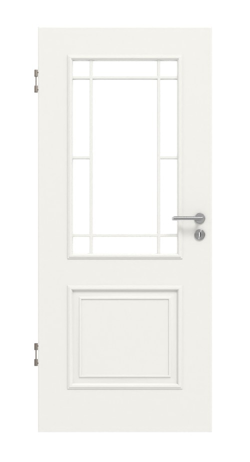 Wzór z przeszklonymi wstawkami w górnej części drzwi umożliwia przyjemny dopływ światła. Poniżej wstawione profile tworzą mniejszy prostokąt w stylu kasetowym, co harmonijnie podkreśla klasyczny design skrzydła drzwiowego. W spokojnej kolorystyce podobnej do odcienia RAL 9016, dekor w białym lakierze pasuje do każdego pomieszczenia. Dzięki swoim właściwościom odpornym na zarysowania i uderzenia, łatwa w pielęgnacji powierzchnia Durat jest odporna na codzienne obciążenia.