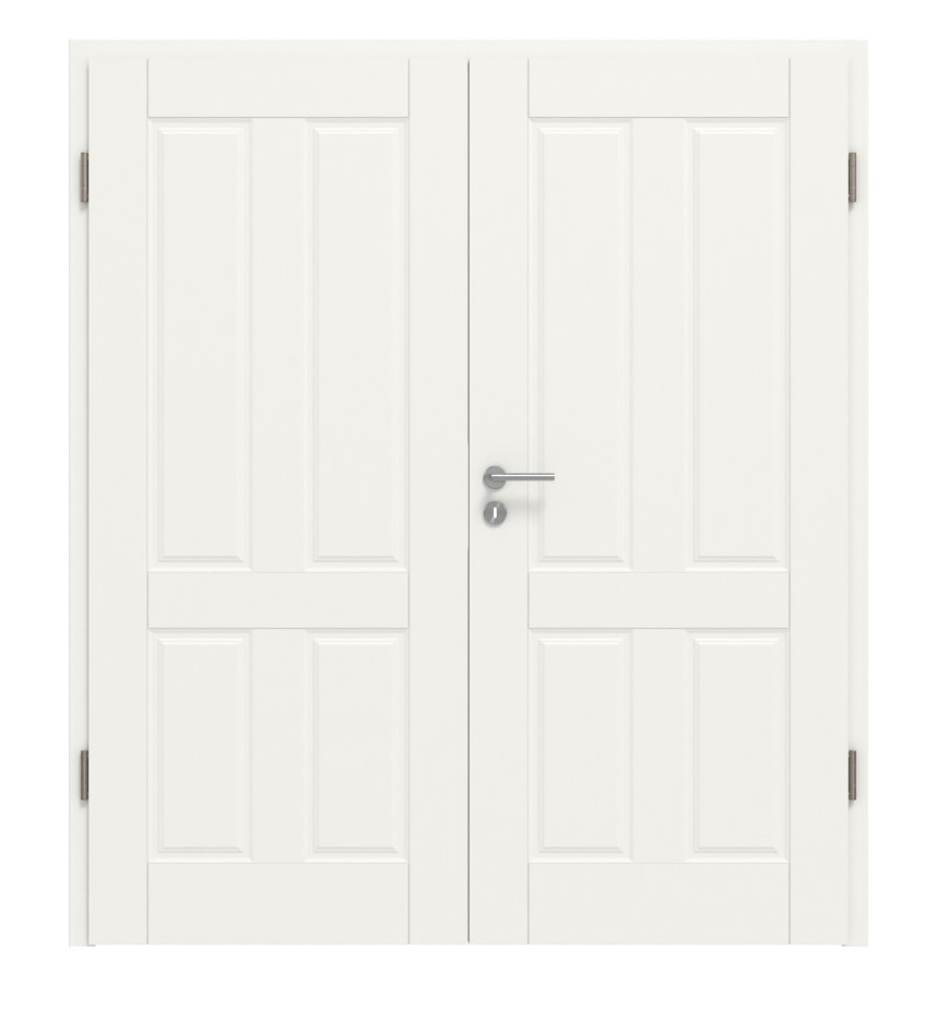 Piękne podwójne drzwi wewnętrzne w białym lakierze z profilami frezowanymi: