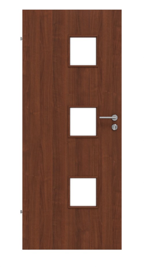 Wyraźne usłojenie nadaje dekorowi orzecha autentyczności. W skrzydle drzwiowym umieszczono trzy kwadratowe przeszklenia. W zestawie znajduje się szkło satynowe.