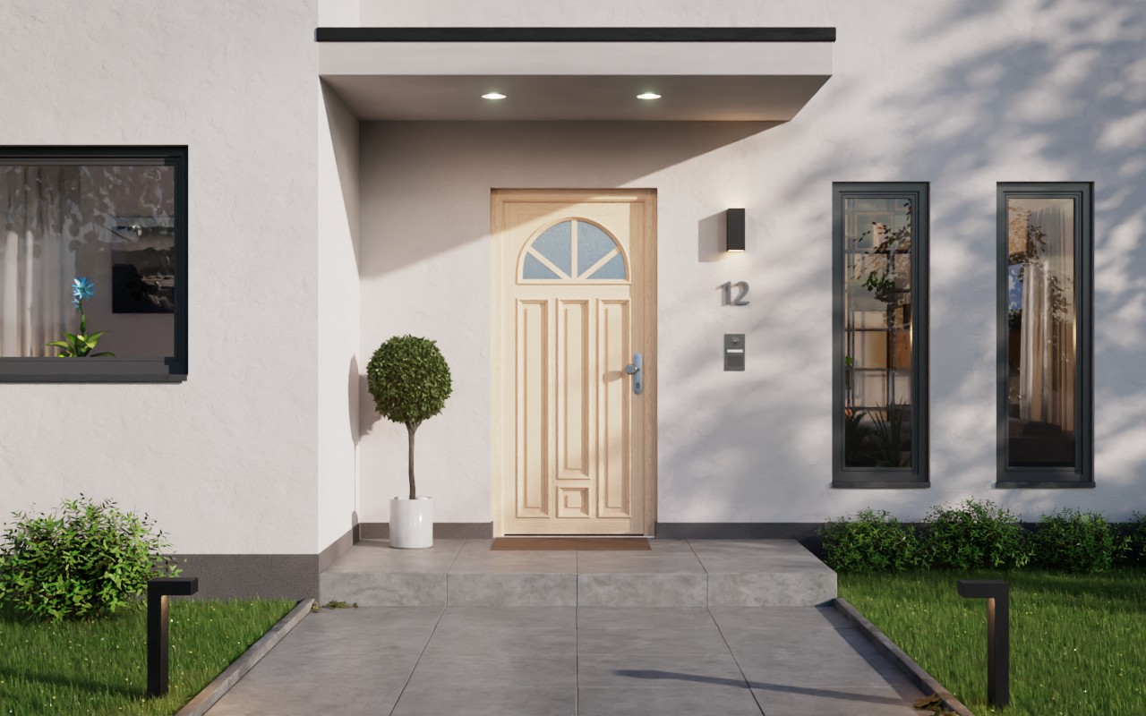 • Zakres dostawy: Drzwi wejściowe z ramą osłonową, progiem podłogowym, zawiasami i zamkiem