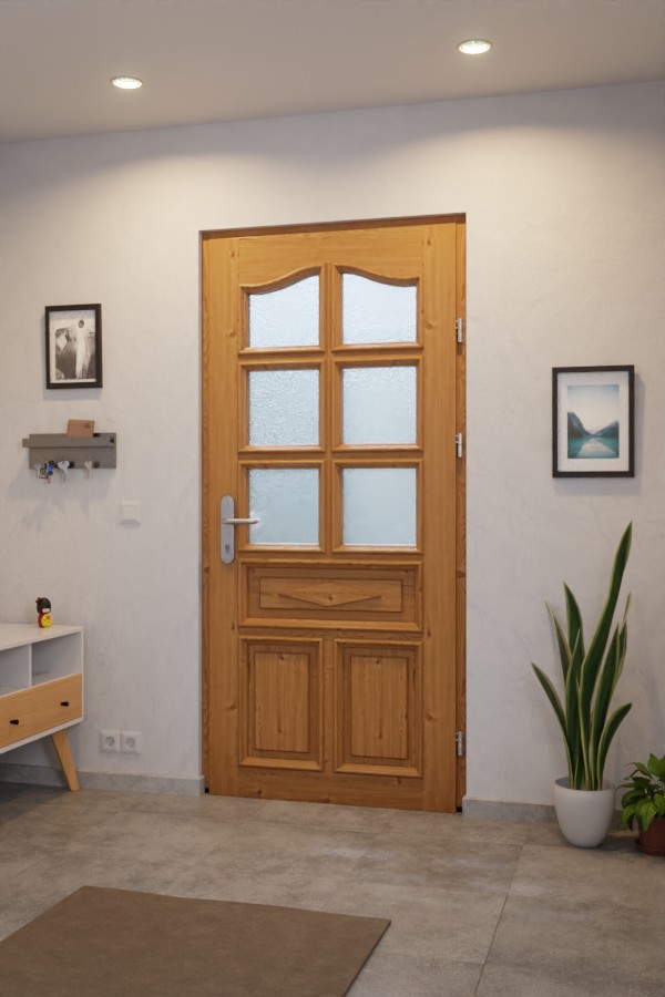 • Konstrukcja: Drzwi wejściowe z warstwowego drewna świerkowego z dwoma poziomami uszczelnienia, Grubość skrzydła drzwiowego: 68 mm