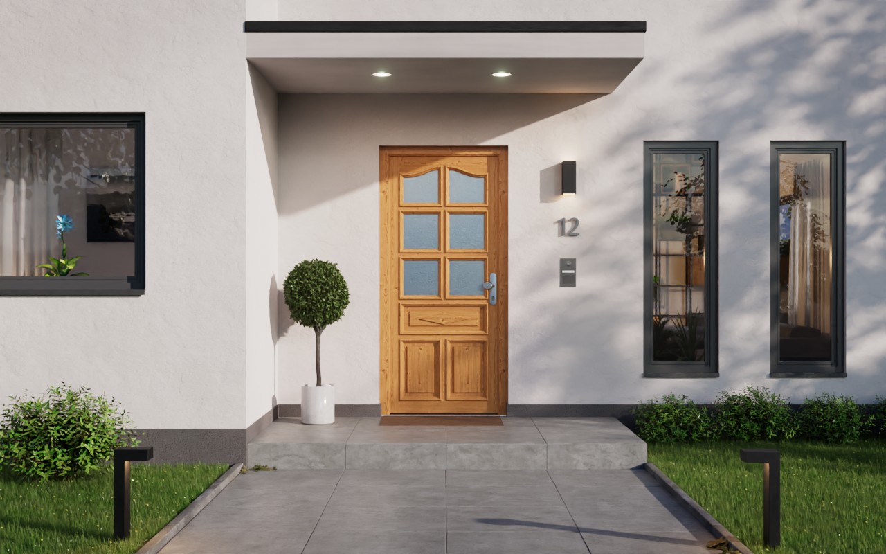 Interio Holz-Haustür Freiburg Fichte Lasur Eiche-Optik Frontansicht außen