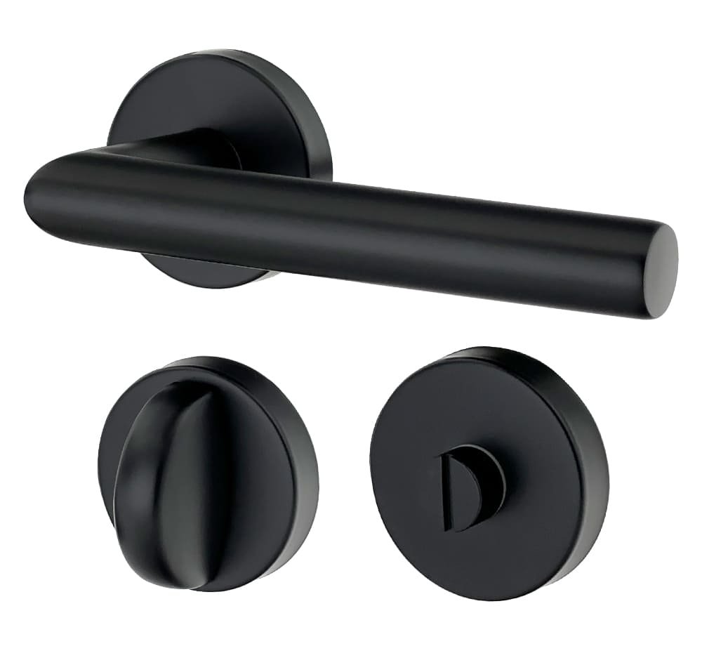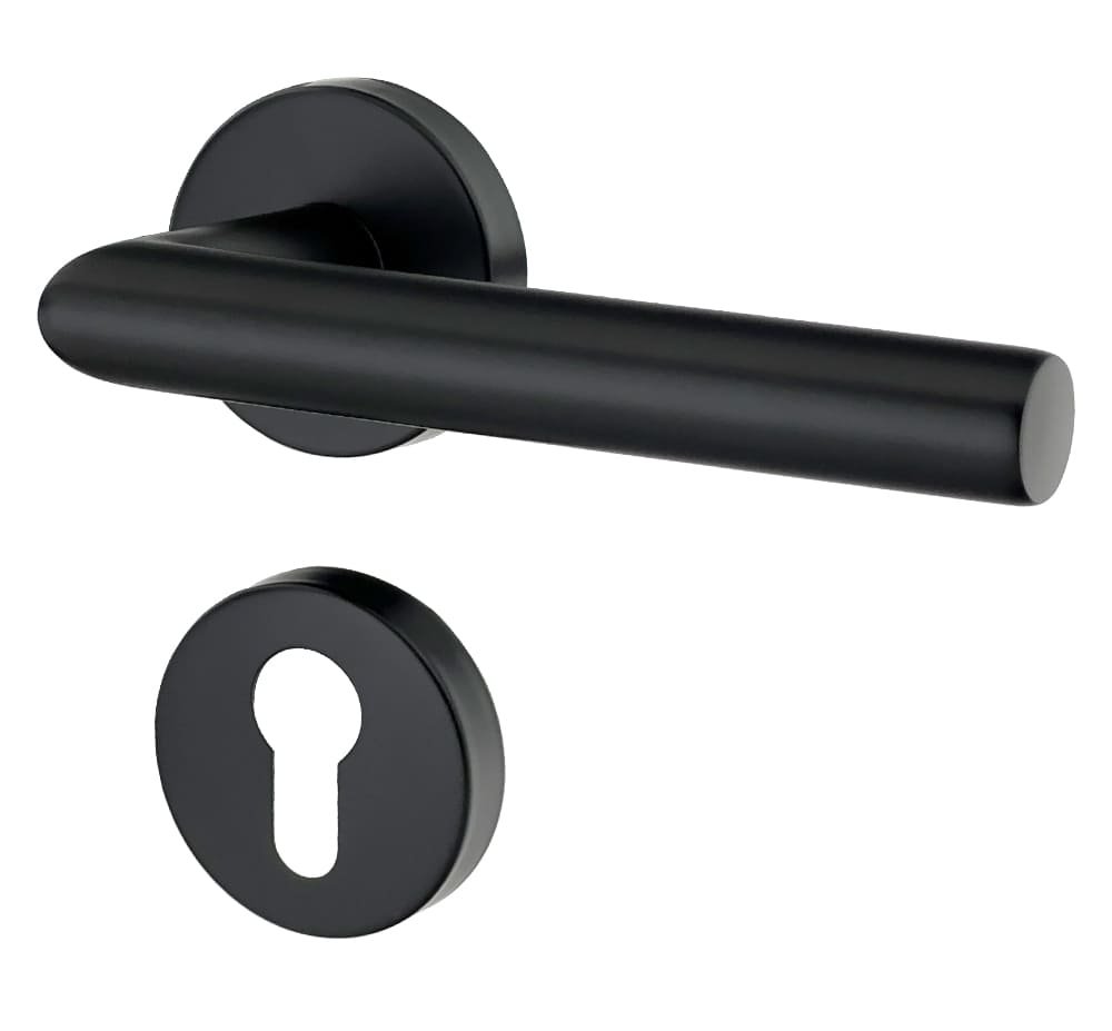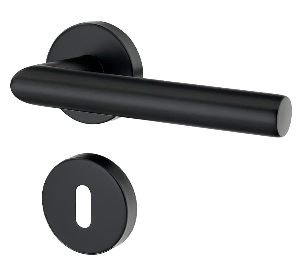 Ergonomicznie ukształtowana klamka drzwiowa znajduje się centralnie na okrągłej rozetce i dzięki dyskretnemu designowi wygodnie leży w dłoni. czarne malowanie zapewnia przyjemną fakturę i nadaje okuć drzwiom ponadczasowy wygląd.