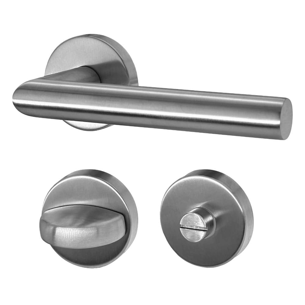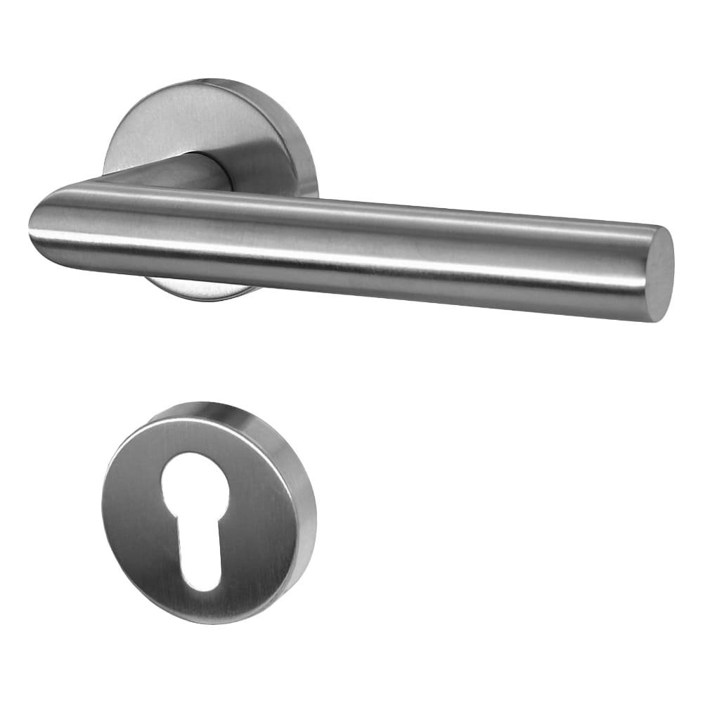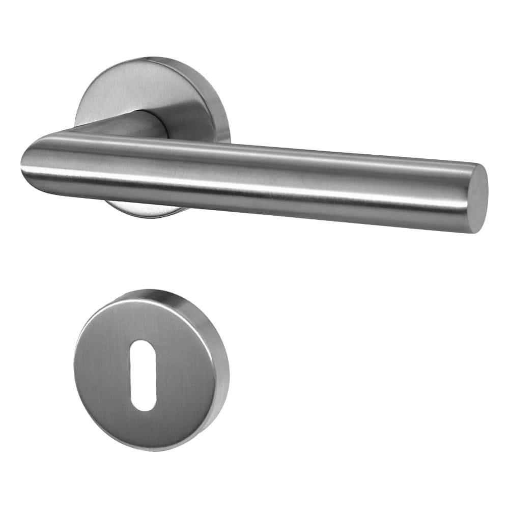 Ergonomicznie ukształtowana klamka drzwiowa znajduje się na środku okrągłej rozetki i dzięki przejrzystemu designowi wygodnie leży w dłoni. Satynowo-matowa powierzchnia ze stali nierdzewnej zapewnia wysokiej jakości wygląd i przyjemną w dotyku fakturę.