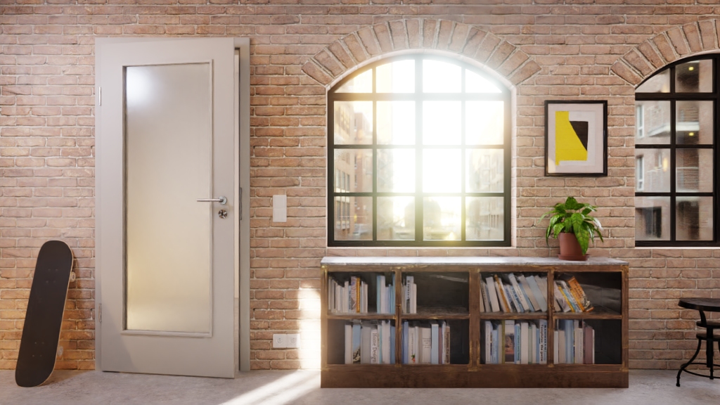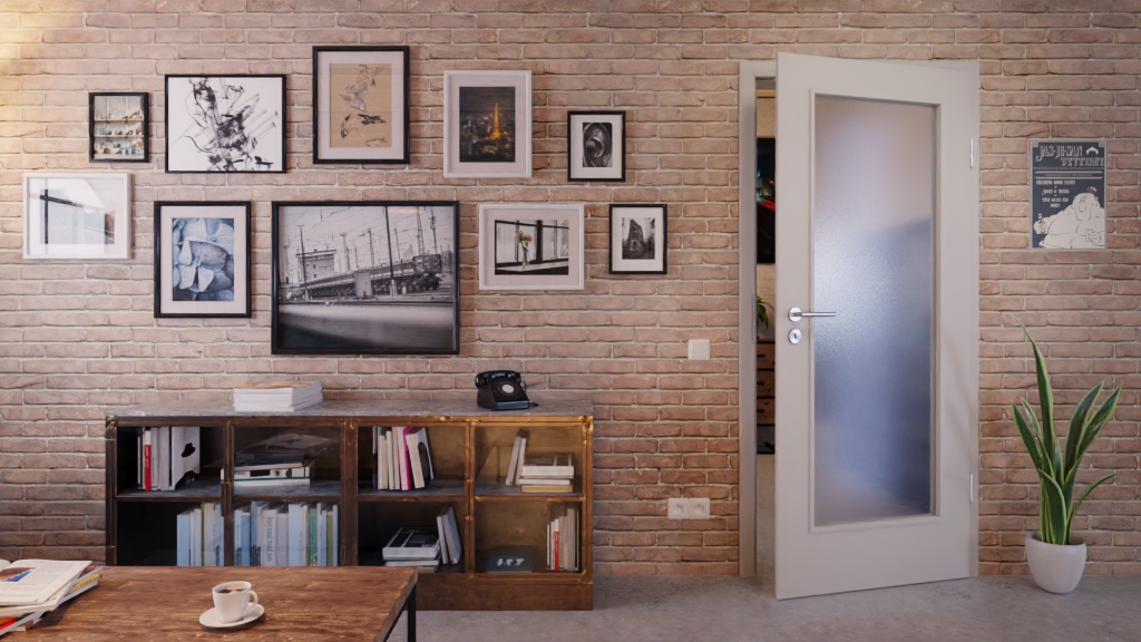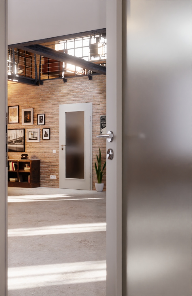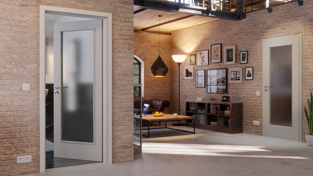 Dzięki swojej kanciastej formie i nałożonym listwom przeszklenie nadaje pokojowi modny klimat. Listwy są dopasowane do jasnoszarego koloru drzwi. Wybór szkła od matowego do przezroczystego niemal nie ma ograniczeń dla Twoich pomysłów projektowych.
