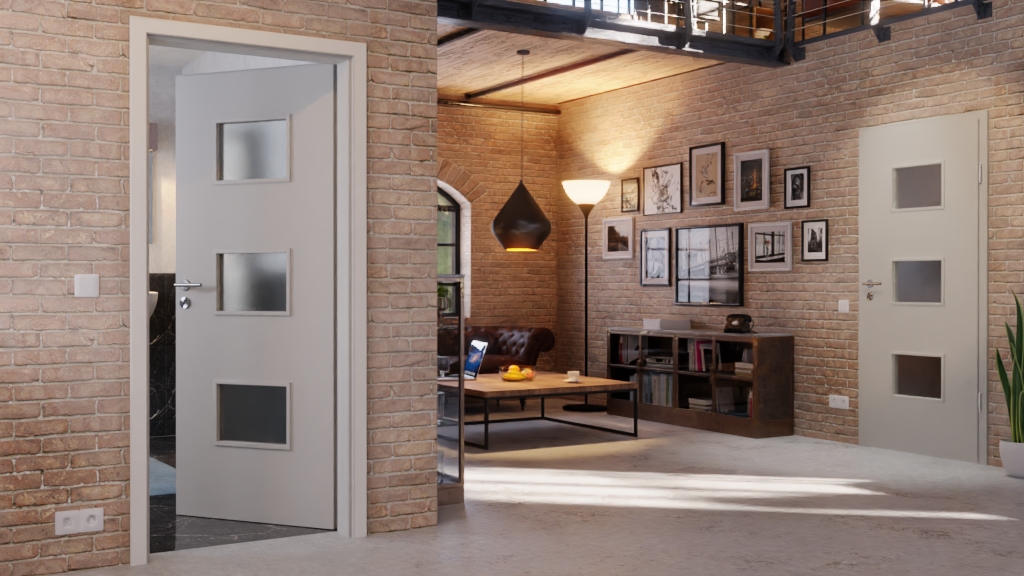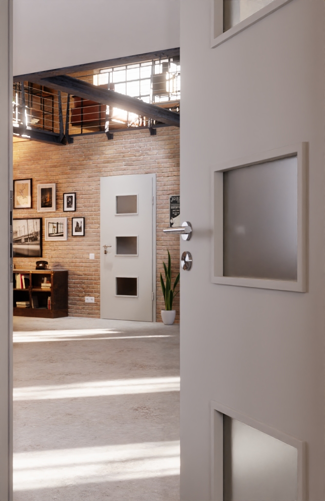 Prostokątne otwory szklane w środkowej części drzwi zapewniają obfite światło. Dodatkowo umożliwiają spojrzenie na przeciwną stronę oraz chronią przed uszkodzeniem szkła w dolnej części drzwi.