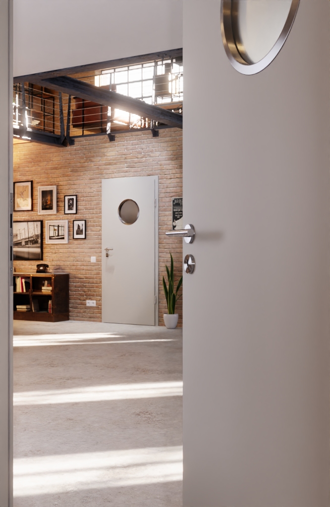 W górnej części drzwi znajduje się przeszklenie. Dzięki podwyższonej pozycji widok do Twojego pomieszczenia jest ograniczony. Standardowo oprawione w stal nierdzewną lub opcjonalnie w lite drewno bukowe, bullauge wpuszcza światło z góry.