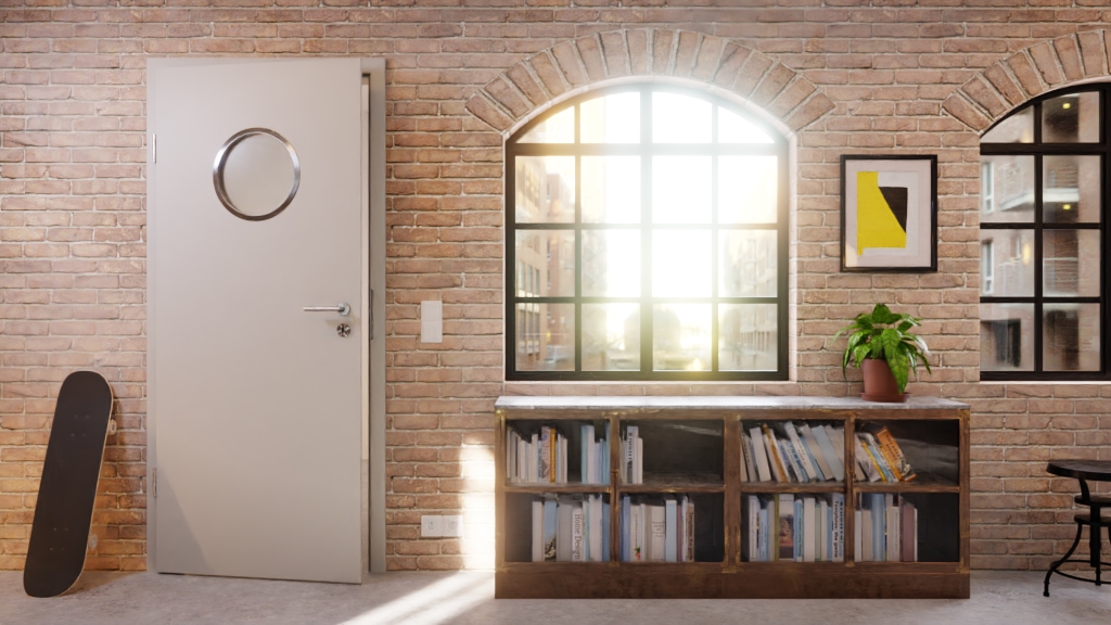 okrągły otwór świetlny w górnej części skrzydła drzwiowego