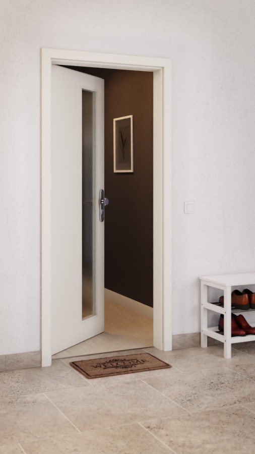 Podstawą skrzydła drzwiowego jest wysokiej jakości płyta wiórowa pełna w rdzeniu. Wliczone w cenę szklenie tworzy z modelem harmonijną całość.
