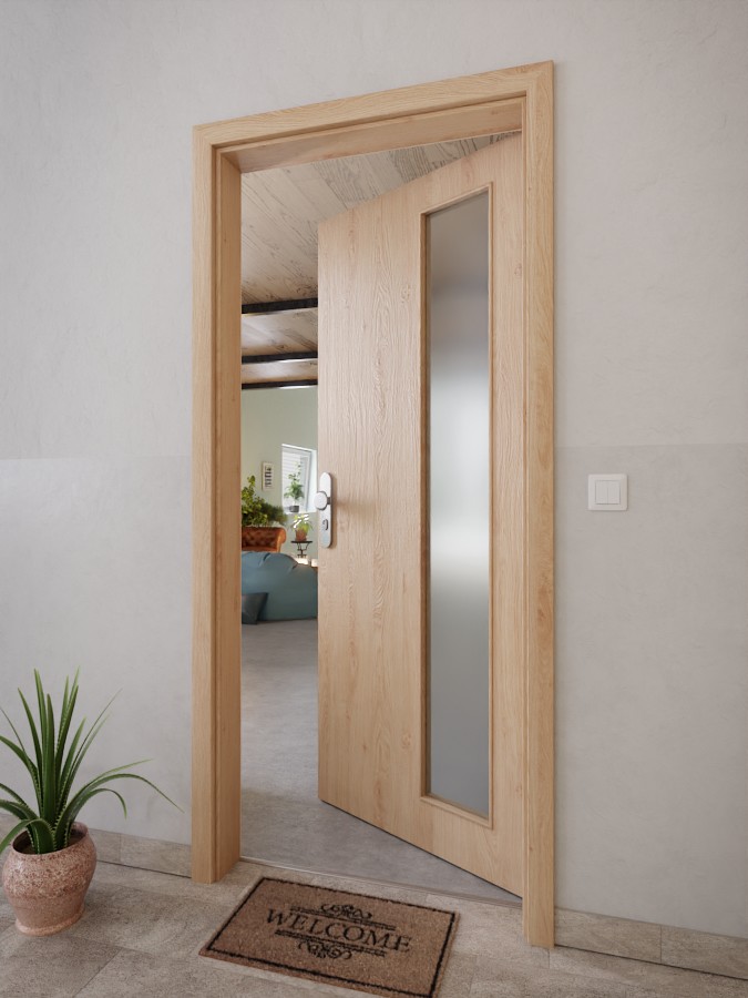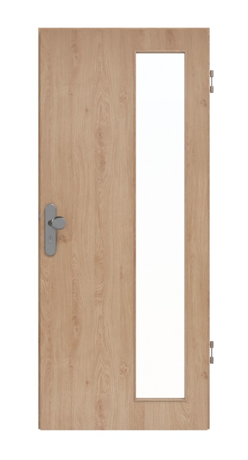 Jasne tony i delikatne usłojenie definiują wygląd dekoru. Dzięki powłoce CPL skrzydło drzwiowe jest odporne na wpływy mechaniczne i promieniowanie UV. Boczne przeszklenie pozwala na kontrolowane i subtelne wpuszczanie światła.