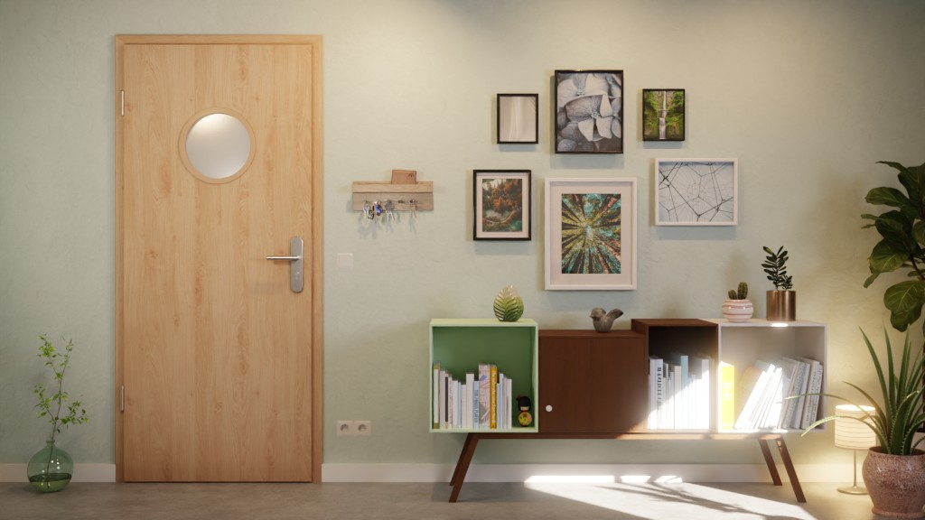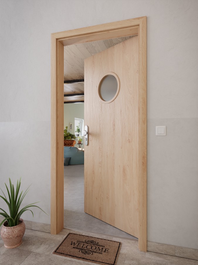 Dekor wyróżnia się jasną kolorystyką w połączeniu z delikatnym usłojeniem. Dzięki powłoce CPL skrzydło drzwiowe jest odporne na uszkodzenia mechaniczne i promieniowanie UV. Bulaj zapewnia subtelne oświetlenie w górnej części drzwi.