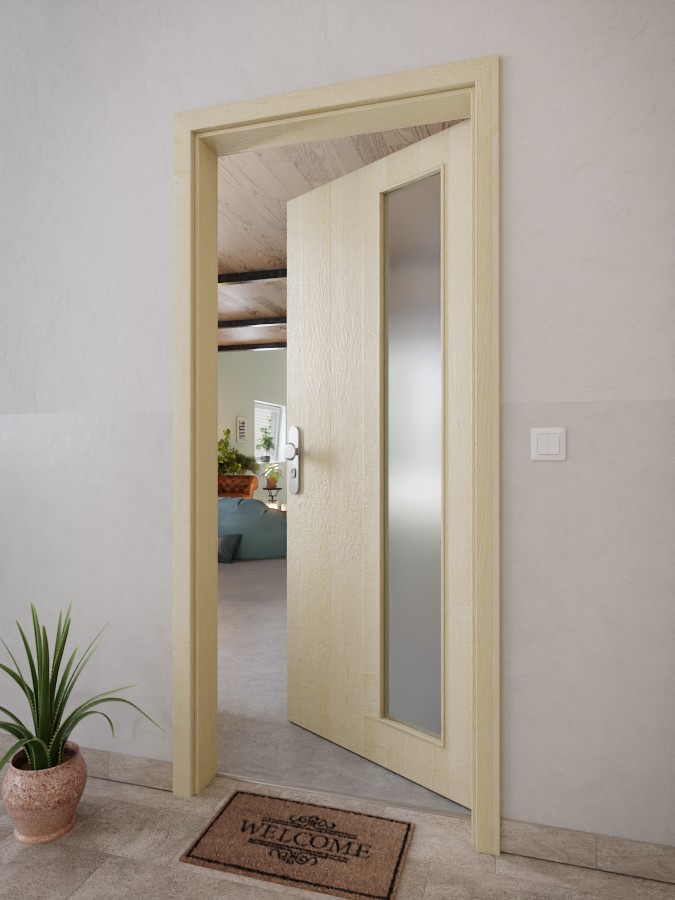 Jasnobrązowy dekor charakteryzuje się bogatym w detale wzornikiem, który imituje przebieg słojów drzewnych. Przeszklenie po stronie zawiasów drzwiowych pozwala na dyskretny dopływ światła.