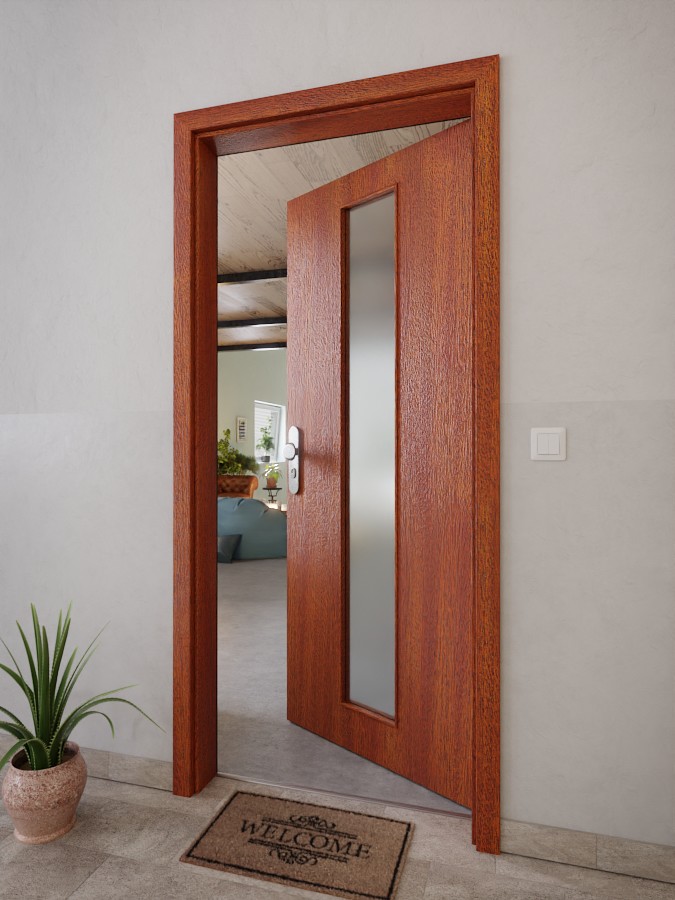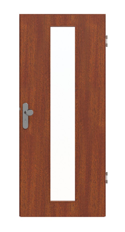 Fornir z litego drewna nadaje powierzchni drzwi elegancki i naturalny wygląd. Indywidualne ułożenie słojów i struktury sprawia, że każdy egzemplarz jest wyjątkowy. Przeszklenie w środku drzwi pozwala delikatnie przenikać światłu.