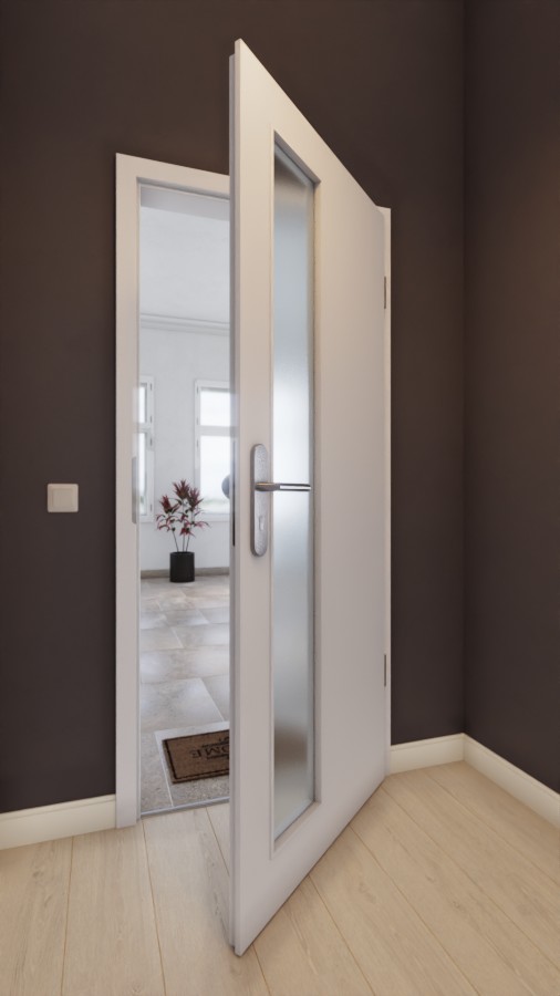 Wewnątrz skrzydła drzwiowego znajduje się płyta pełna, która nadaje modelowi szczególnie solidny charakter. Wliczone w cenę szklenie harmonijnie uzupełnia model.