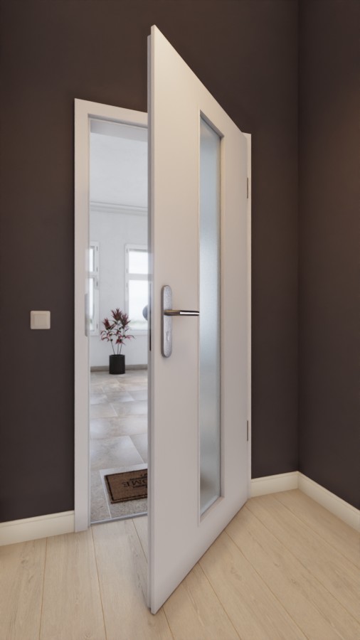 Drzwi w kolorze szaro-białym zachwycają wysoką uniwersalnością w łączeniu z różnorodnymi elementami wyposażenia. Dzięki powłoce CPL nie musisz martwić się o zarysowania, uderzenia ani działanie promieni UV. Centralnie umieszczony przeszklenie subtelnie przepuszcza światło.