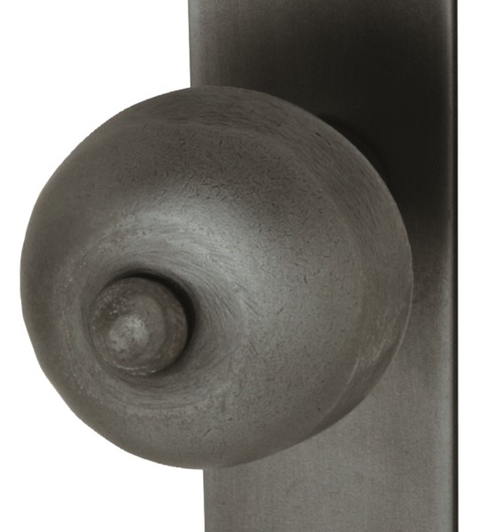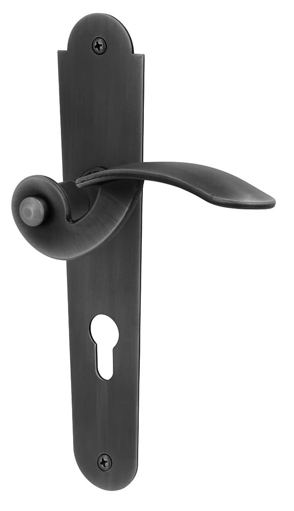 Wykonany z czarnej, satynowanej stali zestaw z długą tarczą zachwyca prostym wyglądem i stylowymi łukami. Płaska, delikatnie wygięta klamka uzupełnia rustykalne wykończenie wizualne.