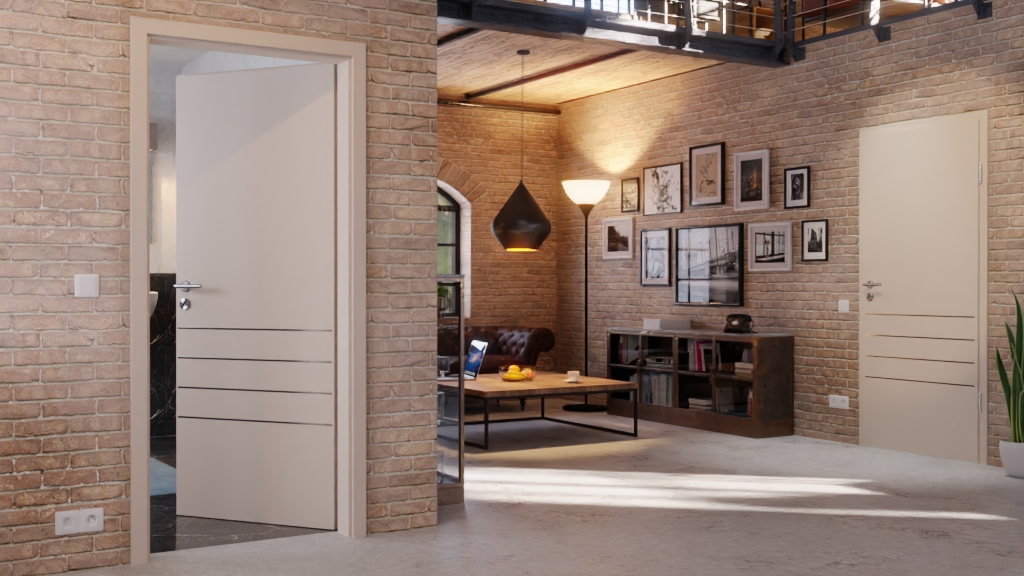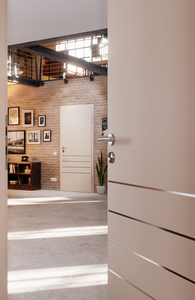 Ciepła, beżowa powierzchnia nadaje pomieszczeniu harmonijny charakter. Całościowy projekt jest urozmaicony czterema lizenami, które biegną wzdłuż dolnej części skrzydła drzwiowego.