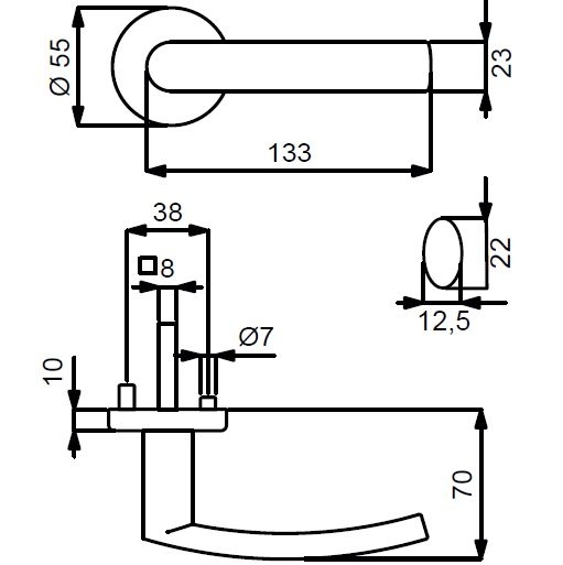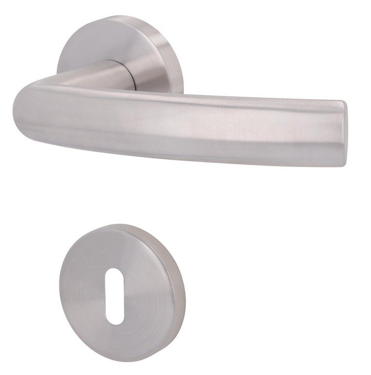 Półzestaw z matowego stali nierdzewnej składa się z okrągłych rozet i subtelnie wygiętego klamki. Zintegrowana sprężyna powrotna zawsze przywraca klamkę do poziomu.