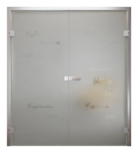 Design drzwi dwuskrzydłowych dominują różne terminy związane z kawą na skrzydle ruchomym i skrzydle stałym. Składają się z różnych specjałów kawowych i tworzą harmonijną całość. Satynowane skrzydło drzwiowe zapewnia elegancką ochronę przed wzrokiem ciekawskich, jednocześnie przepuszczając do pomieszczenia wystarczającą ilość światła. Motywy z szkła przezroczystego nie tylko przyciągają wzrok w tym modelu, ale także przyczyniają się do harmonijnego rozproszenia światła. W ten sposób powstaje przytulna atmosfera, która zachęca do odpoczynku.