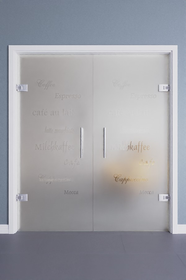 Eleganckie dwuskrzydłowe szklane drzwi wahadłowe przyciągną wzrok wszystkich miłośników kawy. Nazwy różnych specjałów kawowych są przezroczyste i wyraźnie wyróżniają się na matowym tle. Słowa są napisane w różnych czcionkach, co zapewnia urozmaicony wygląd.