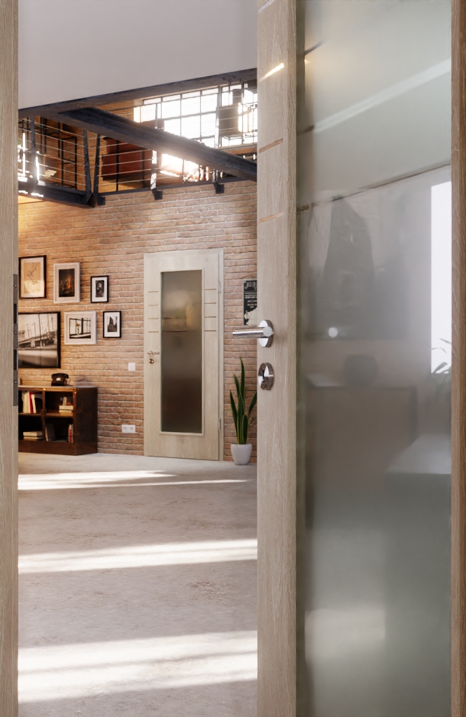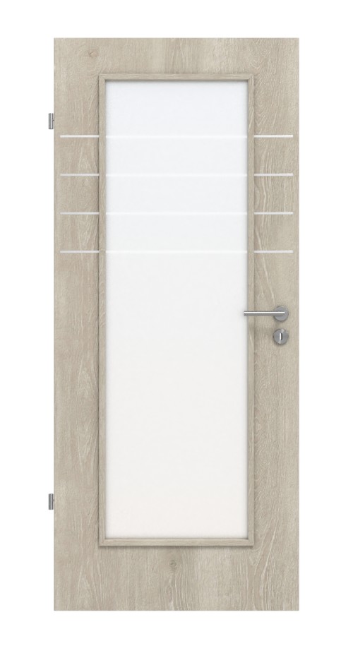 Skrzydło drzwiowe z żywą powierzchnią dekoracyjną w optyce drewna zyskuje nowoczesny i otwarty wygląd dzięki przeszkleniu pośrodku. Efekt dopełniają cztery pasy w górnej części skrzydła.