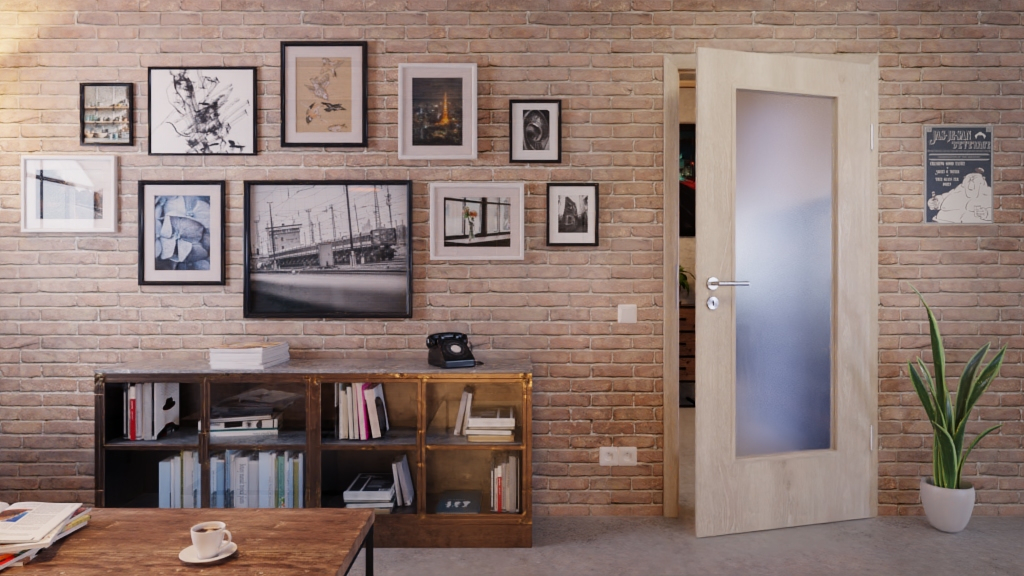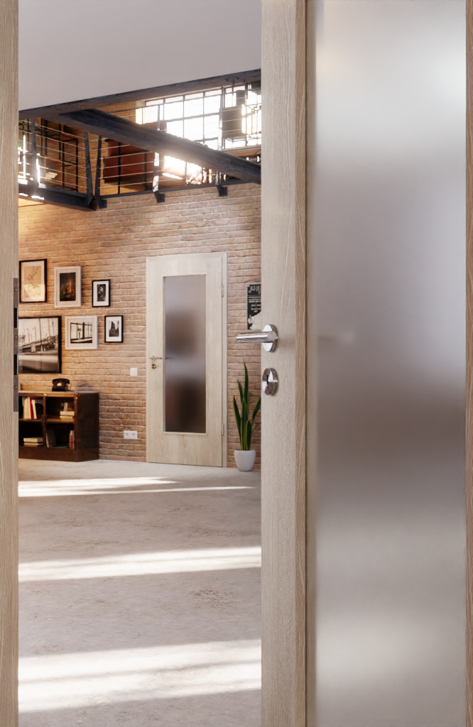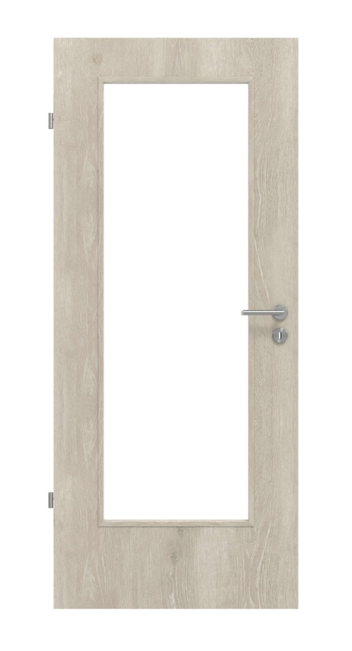 Skrzydło drzwiowe z żywą powierzchnią dekoracyjną imitującą drewno zyskuje nowoczesny i otwarty wygląd dzięki przeszkleniu w środkowej części. W przypadku szkła można wybierać między wykonaniem przezroczystym a satynowym.
