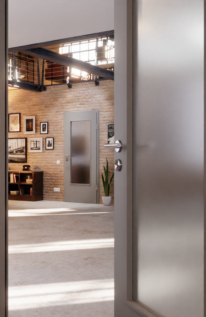 Prostokątowe okno świetlne z nałożonymi listwami szklanymi wprowadza nowoczesny klimat. Dzięki podwyższonej konstrukcji stanowi standard dla wszystkich otworów świetlnych. Ta podwyższona pozycja zapewnia ochronę przed stłuczeniem szkła w dolnej części drzwi.