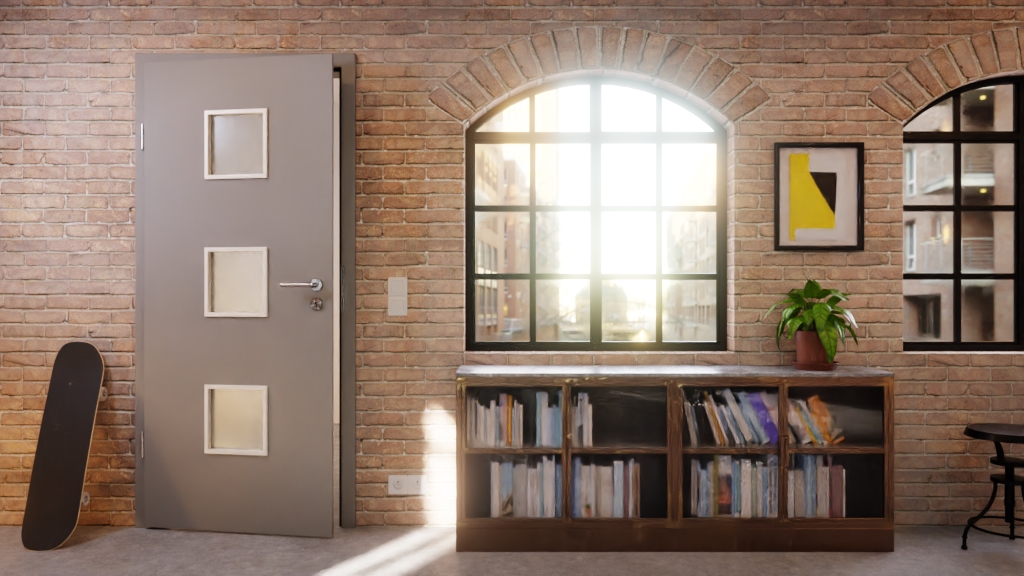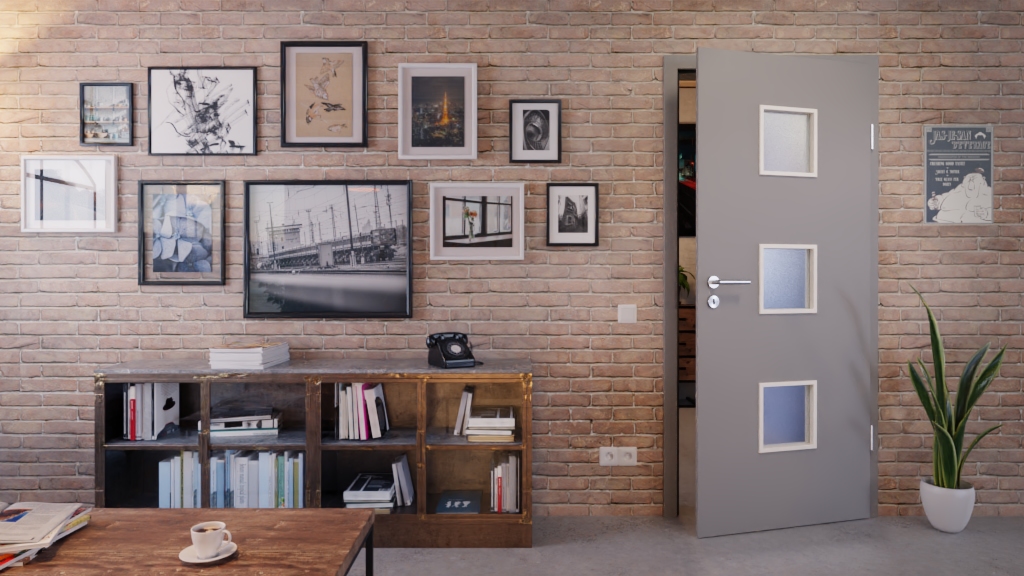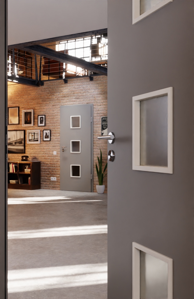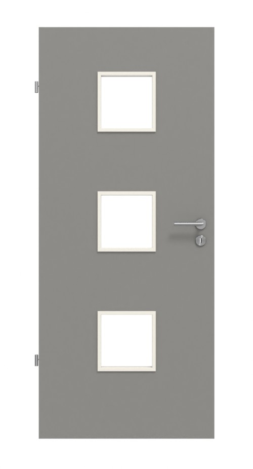 Otwór świetlny z nałożonymi listwami w kształcie prostokąta nadaje pomieszczeniu nowoczesny charakter. Trzy kwadratowe otwory świetlne w środku drzwi zachwycają wszechstronnością. Ich rozmieszczenie umożliwia trzy efekty: widok na zewnątrz, wystarczającą ilość światła oraz chroniony dolny obszar drzwi przed uszkodzeniami.
