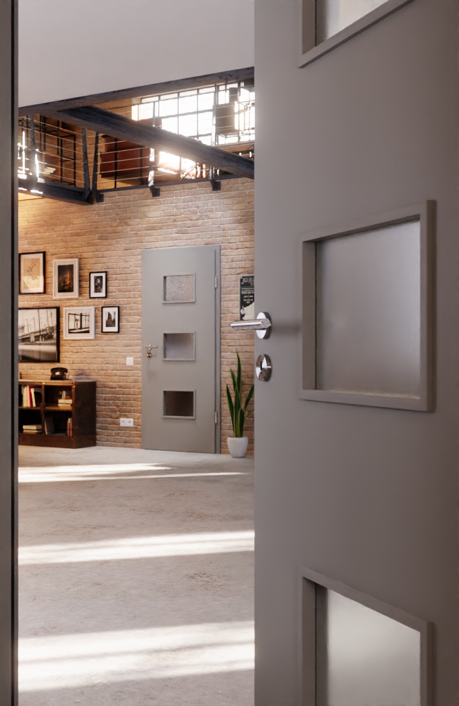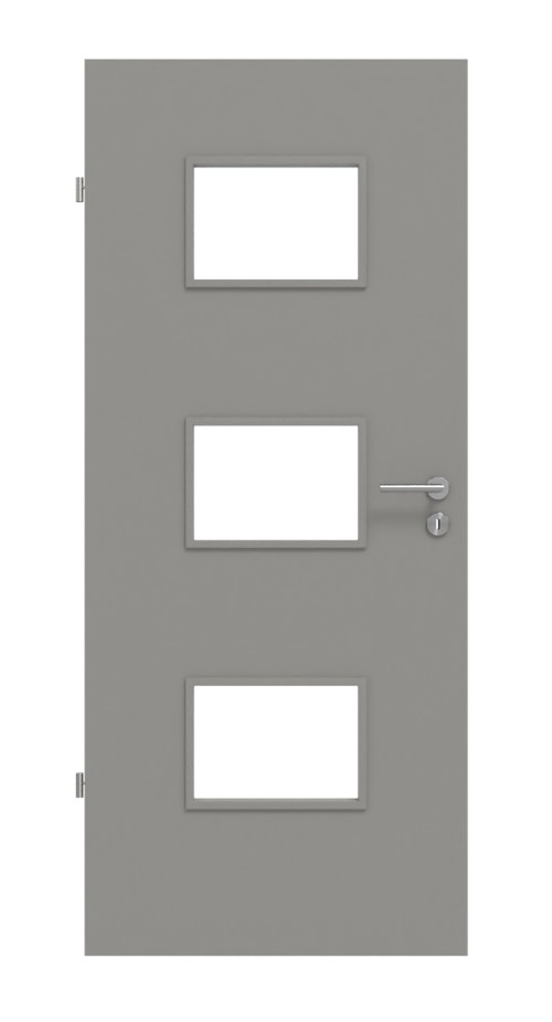 Trzy prostokątne przeszklenia są umieszczone jedno nad drugim w środku drzwi wewnętrznych. Dzięki temu wpuszczają światło, umożliwiają widok na drugą stronę i chronią przed stłuczeniem szkła w dolnej części drzwi.