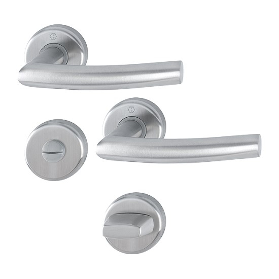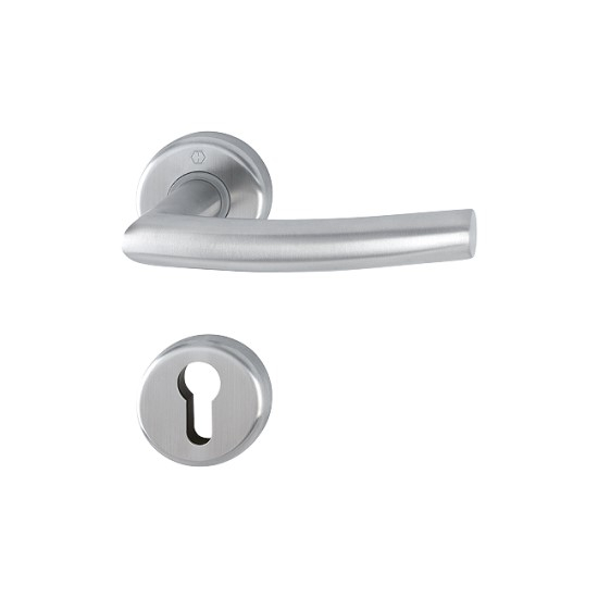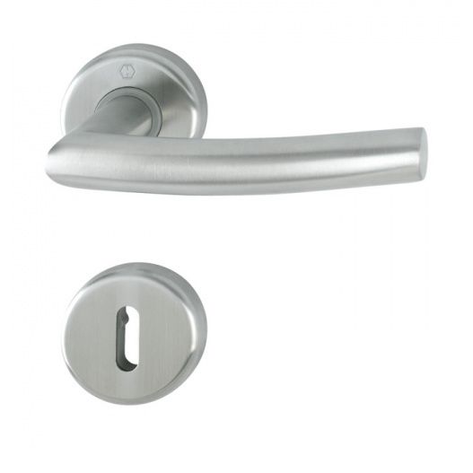 Powierzchnia z nierdzewnej stali sprawia, że zestaw do drzwi wewnętrznych jest trwały i odporny na ścieranie nawet przy intensywnym użytkowaniu. Zestaw składa się z okrągłej rozety z klamką w kształcie litery L wygiętą do skrzydła drzwi oraz rozety na klucz. Montaż odbywa się za pomocą połączenia z profilem i jest szybki oraz łatwy do wykonania.