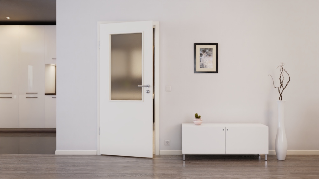 Prostokątny wycięcie szklane znajduje się w górnej części drzwi, co pozwala na wgląd do pomieszczenia. Dolna połowa jest chroniona przed stłuczeniem szkła dzięki podwyższonej pozycji otworu świetlnego.