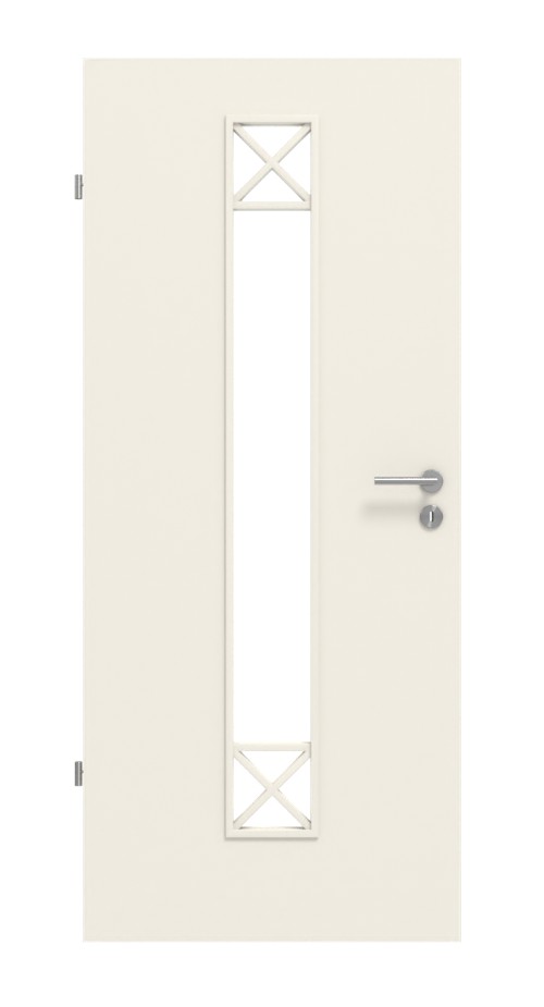 Otwór świetlny z nałożonymi listwami w kształcie prostokąta nadaje pomieszczeniu nowoczesny charakter. Wąskie wycięcie znajduje się na środku drzwi, podkreślając symetrię. Dodatkowo zapewnia widok na całą wysokość drzwi. Designowe przeszklenie z dwóch różnych rodzajów szkła (piaskowane i przezroczyste) oraz nałożone listwy tworzą interesującą estetykę. Nakładające się listwy na końcach otworu tworzą dwa prostokątne wycięcia, które otaczają przeszklenie. Kolorystyka drzwi jest identyczna z listwami i szkłem.