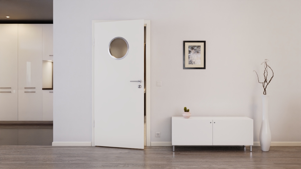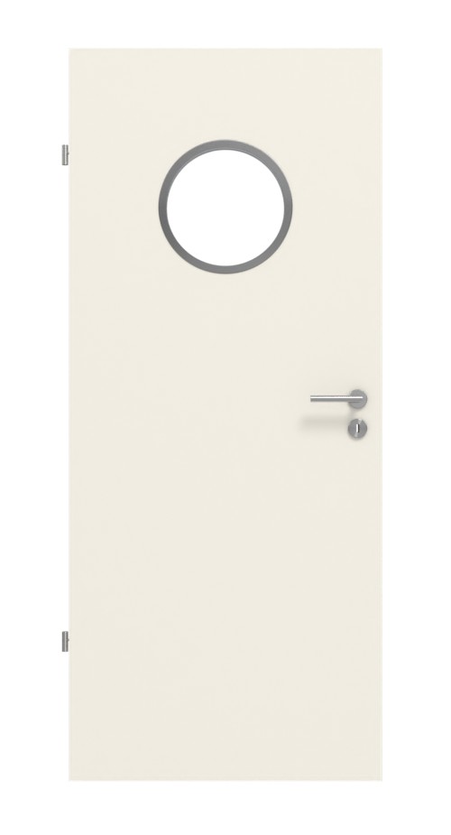 Odkryj przejrzystość w swoim pomieszczeniu: Jednokolorowe drzwi wewnętrzne WestaLack w RAL 9010 od Westag wprowadza atrakcyjny klimat dzięki okrągłemu oknu świetlnemu i ramie z litego drewna pokrytej stalą nierdzewną.